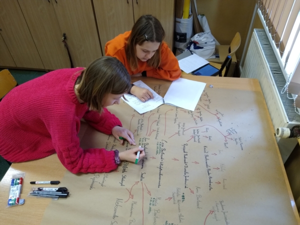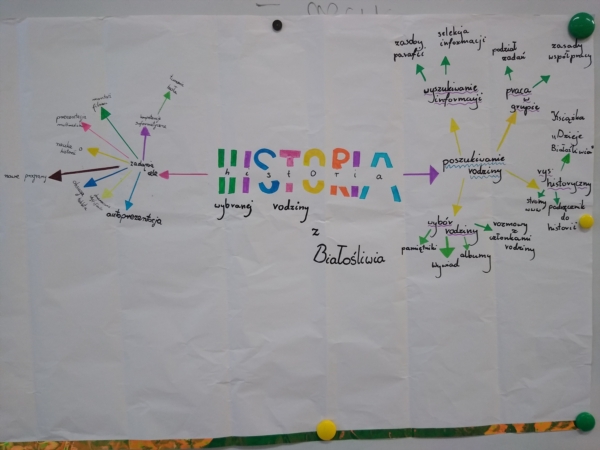 Cała grupa wspólnie opracowała mapę myśli nawiązującą do zadań i celów realizowanych w czasie projektu oraz czynności związanych z poszukiwaniem i opisaniem historii wybranej rodziny.