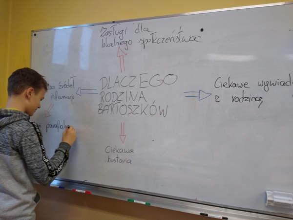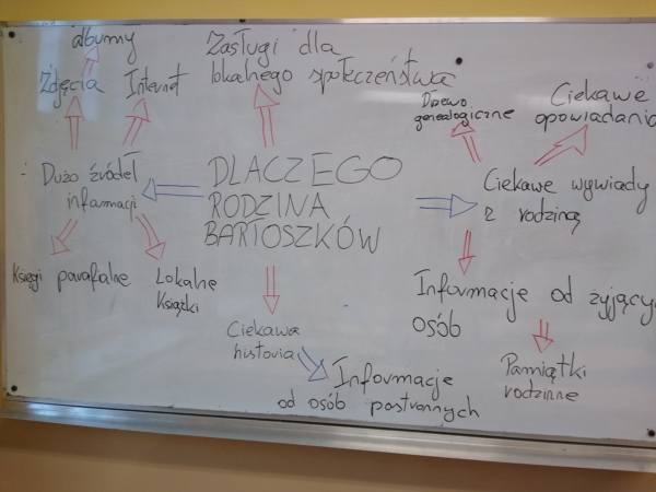 Grupa wykonała mapę myśli dotyczącą wybranej rodziny. Określiła w niej hasła określające skąd będą zdobywali informacje i wiadomości związane z tą rodziną. Uczniowie ustalili treść tematu projektu, który brzmiał : "Historia pewnej rodziny z Białośliwia - rodzina Bartoszków".