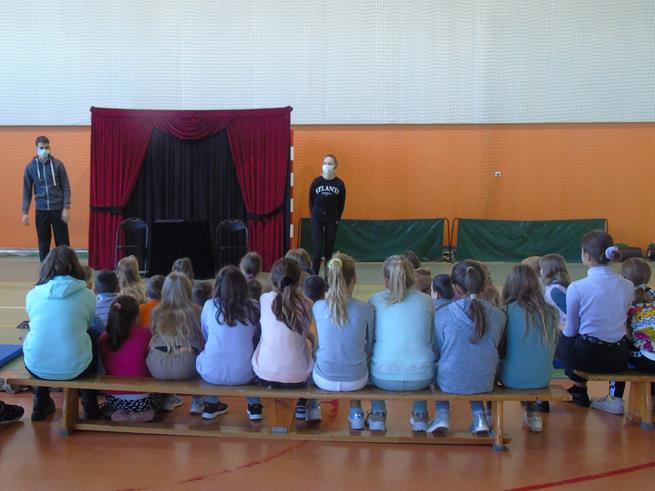 „Jak pokonać Smoka?”, „Czas próby”, „Młody gniewny” – to trzy spektakle w wykonaniu aktorów Teatru Kurtyna w Krakowie, które mieli okazję obejrzeć w grupach oddziałowych wszyscy uczniowie. Każdy ze spektakli, w warstwie merytorycznej, zawierał wartości wychowawczo-profilaktyczne i był adekwatny do odpowiedniej grupy wiekowej. W przystępny i interesujący sposób przedstawiono uczniom zagrożenia na jakie narażeni są młodzi ludzie we współczesnym świecie.