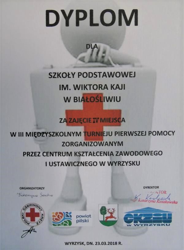 Drużyna z skÅ‚adzie: Kinga Suska, Natalia Borkowska, Oskar Suski reprezentowaÅ‚a biaÅ‚oÅ›liwskÄ… szkołę podczas „III MiÄ™dzyszkolnego Turnieju Pierwszej Pomocy”, który odbyÅ‚ siÄ™ w Centrum KsztaÅ‚cenia Zawodowego i Ustawicznego w Wyrzysku. Turniej odbyÅ‚ siÄ™ pod honorowym patronatem Starosty Pilskiego oraz Burmistrza Wyrzyska, a wzięło w nim udziaÅ‚ 6 uczniowskich drużyn – Wyrzysk, Osiek nad NoteciÄ…, Kosztowo, Falmierowo, BiaÅ‚oÅ›liwie i Wysoka. Każda z drużyn musiaÅ‚a zmierzyć siÄ™ z testem z zakresu pierwszej pomocy oraz pozorowanymi scenkami, podczas których należaÅ‚o wykazać siÄ™ wiedzÄ… praktycznÄ…. Celem tej miÄ™dzyszkolnej rywalizacji byÅ‚o podniesienie wiedzy uczniów z zakresu udzielania pierwszej pomocy oraz przeciwdziaÅ‚anie wystÄ™powania wypadków poprzez upowszechnienie zasad bezpieczeÅ„stwa. BiaÅ‚oÅ›liwska drużyna zdobyÅ‚a IV miejsce. Gratulujemy!