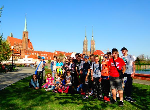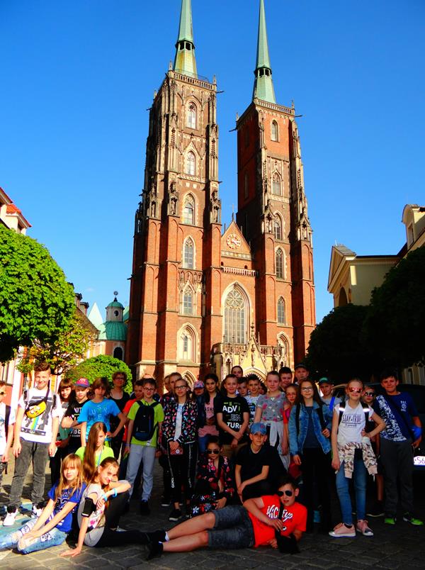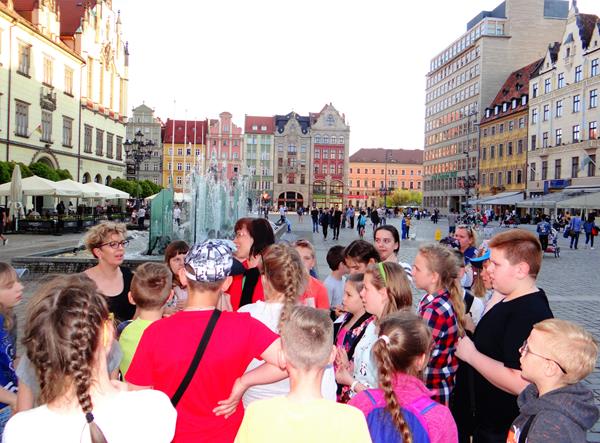 Wrocław – będący jednym z piękniejszych miast Dolnego Śląska, stał się celem wycieczki uczniów klas piątych. W czasie dwudniowego programu zwiedzania (19-20 kwietnia) uczniowie mieli możliwość zobaczenia ciekawych i niezwykłych miejsc tego różnorodnego miasta. Wśród architektonicznych osobliwości poznawanego miasta znalazł się Stary Rynek, będący jednym z największych dawnych placów targowych w Polsce (3,8 ha) wraz z unikatowym na skalę europejską gotyckim Ratuszem, który pełnił siedzibę dawnych władz miejskich i sądowniczych Wrocławia. Na trasie spaceru znalazł się również Ostrów Tumski – najstarsza część Wrocławia, gdzie znajduje się m.in.: gotycka katedra pw. Jana Chrzciciela, kolegiata Świętego Krzyża, kościół św. Bartłomieja, pomnik św. Jana Nepomucena, Pałac Arcybiskupi a także Most Tumski, na którym od kilkunastu lat zakochani wieszają kłódki, symbolizujące trwałość ich miłości. Spośród nowoczesnych form wystawienniczych uczniowie odwiedzili Hydropolis - Centrum Wiedzy o Wodzie, gdzie za pomocą różnorodnych multimedialnych technologii, interaktywnych instalacji oraz wiernym replikom i dotykowym ekranom ukazuje się wodę z różnych fascynujących perspektyw. Dużym zaciekawieniem cieszył się najstarszy w Polsce Ogród Zoologiczny, gdzie można było poznać rzadkie i oryginalne zwierzęta ze wszystkich kontynentów, oraz Afrykanarium - jedyne na świecie oceanarium poświęcone wyłącznie faunie Afryki. Na zakończenie swojego pobytu we Wrocławiu uczniowie podziwiali Panoramę Racławicką, czyli monumentalne malowidło o wymiarach 114 na 15 metrów, które przedstawia zwycięską bitwę Polaków nad Rosjanami pod Racławicami w kwietniu 1794 roku. Opiekę nad uczniami, podczas wrocławskiej wycieczki, sprawowali wychowawcy klas: Piotr Coblewski (Va), Beata Czajkowska (Vb) oraz Magdalena Mielnik.