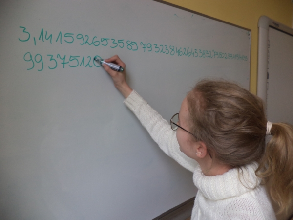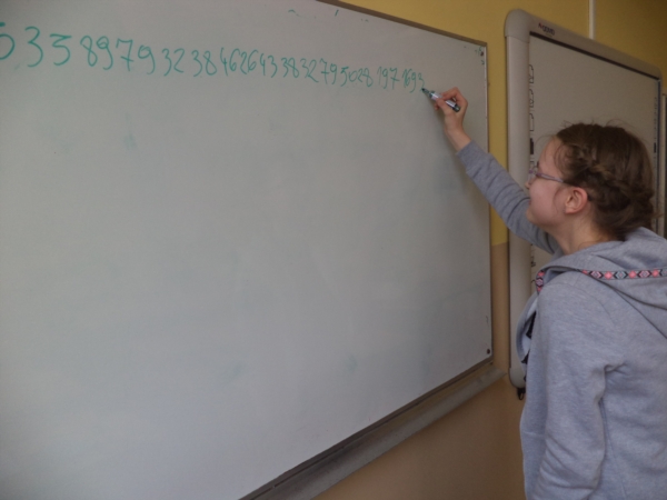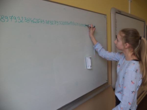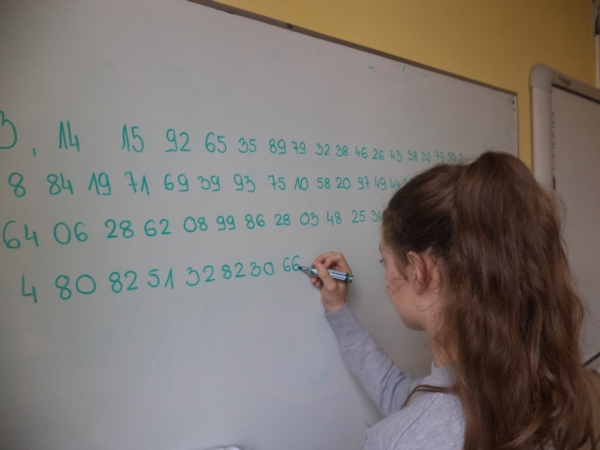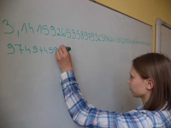 14 marca obchodziliśmy Międzynarodowy Dzień Liczby Pi. Tegoroczne obchody tej szczególnej dla matematyki liczby, związane były już z tradycyjnym zapisywaniem z pamięci jej cyfr z rozwinięcia dziesiętnego. Najlepszy wynik uzyskała Izabela Włodarek - 187 cyfr, drugie miejsce przypadło Martynie Mikołajczak (109), zaś trzecie Marii Krauze (108). Na wyróżnienie zasługują także: Klaudia Babicz, Magdalena Golińska i Matylda Wotzka.