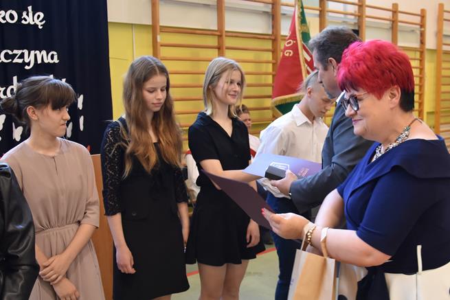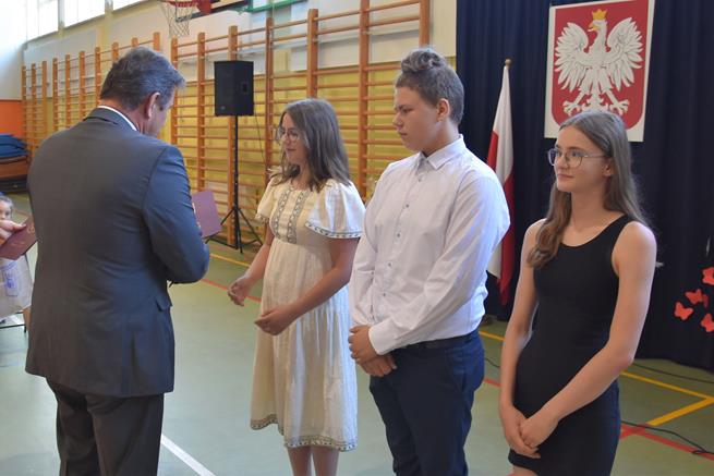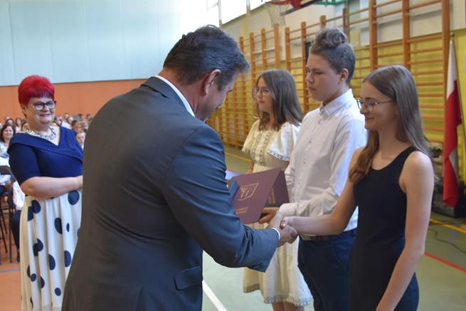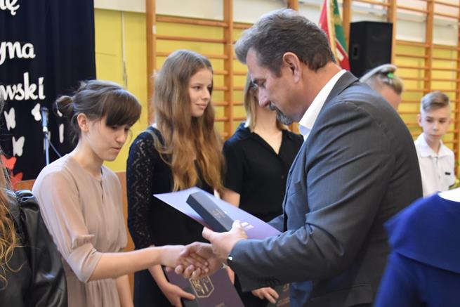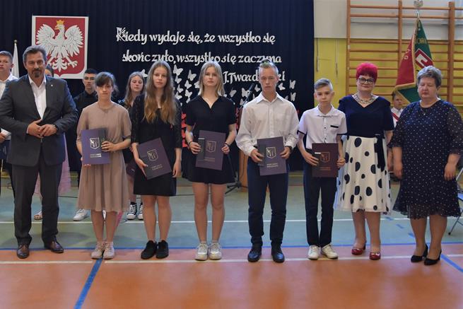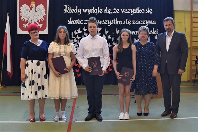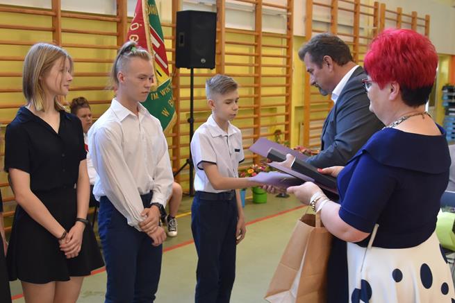 Podczas uroczystości zakończenia roku szkolnego 2021/2022 wójt gminy Białośliwie – Krzysztof Rutkowski wraz z zastępcą – Marleną Hajman wręczyli uczniom białośliwskiej szkoły podstawowej stypendia przyznawane w ramach „Gminnego Programu Wspierania Edukacji Uzdolnionych Dzieci i Młodzieży”.
