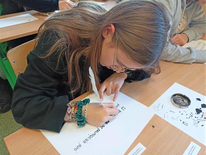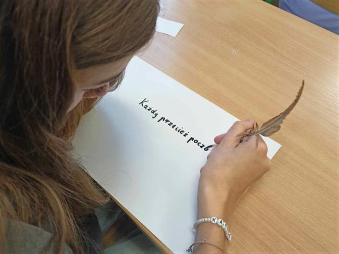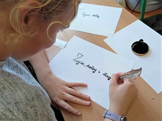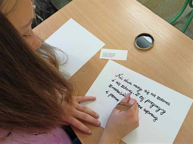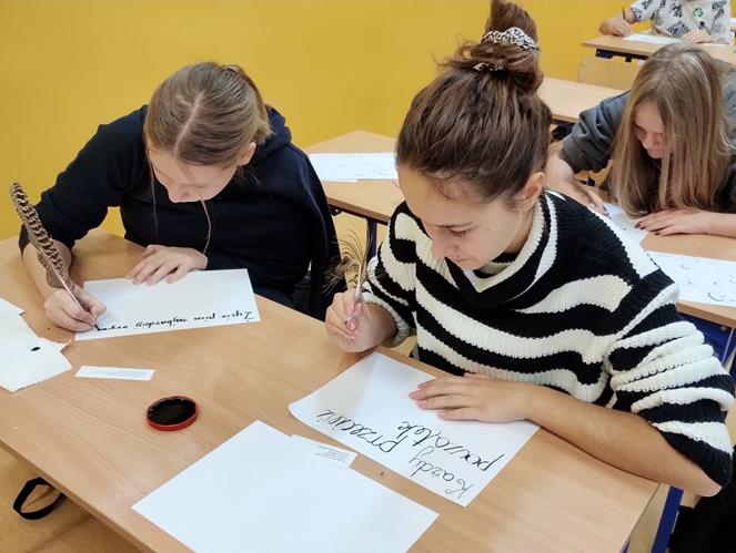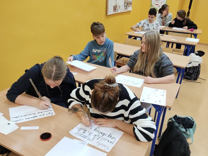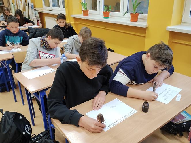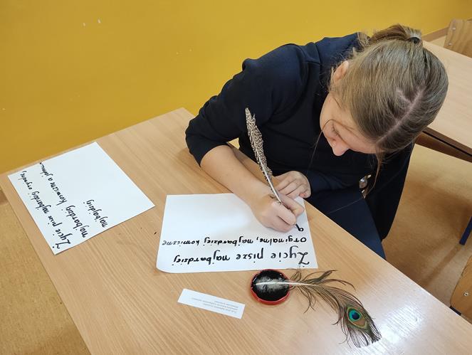 Dla zaakcentowania tych ogólnopolskich wydarzeÅ„ oraz popularyzowania jej twórczoÅ›ci uczniowie klas VI-VII podjÄ™li podczas zajęć z historii próbÄ™ uwiecznienia wybranych cytatów z jej poezji i aforyzmów zapisem gÄ™siego pióra. ByÅ‚a to również okazja do zmierzenia siÄ™ z technikÄ… pisarskÄ…, którÄ… wykonywali Å›redniowieczni skrybowie przed wynalezieniem druku. A wiÄ™c poezja zmierzyÅ‚a siÄ™ z historiÄ…! (woco)