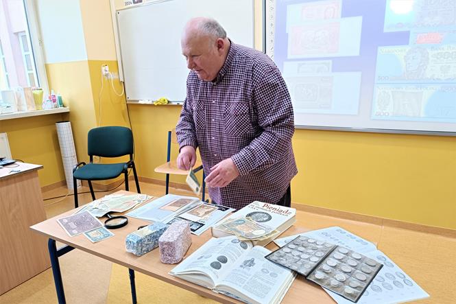 W środę 6 marca uczniowie klasy IV a uczestniczyli w realizacji jednego z zadań – w warsztacie z udziałem zaproszonych gości: państwa Justyny i Jacka Kromulskich. Pan dr Jacek Kromulski - fizyk i numizmatyk - przybliżył uczniom historię złotego, pokazał monety i banknoty emitowane przez Narodowy Bank Polski. Czwartoklasiści dowiedzieli się, jak kształtowały się ceny i zarobki przez ostatnie 100 lat. Poznali i zobaczyli monety oraz banknoty kolekcjonerskie, które emituje NBP. W trakcie warsztatów sami spróbowali zaprojektować swój banknot kolekcjonerski.